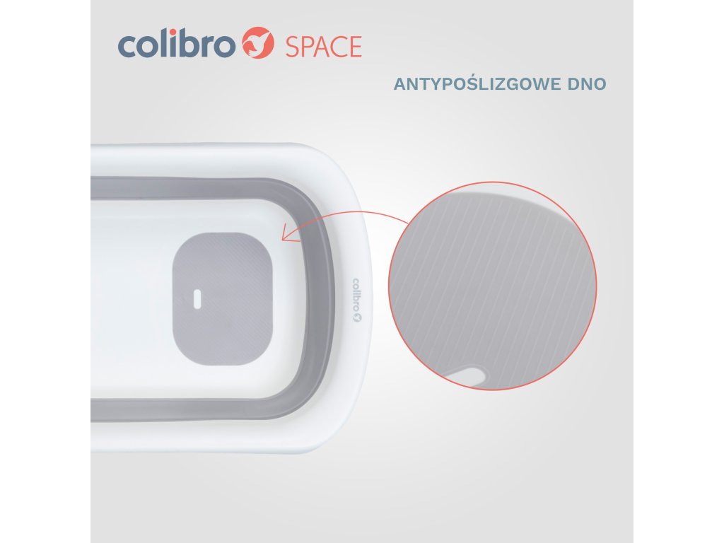 Vanička COLIBRO SPACE má zabudovanú gumenú protišmykovú podložku, ktorá zabraňuje pošmyknutiu dieťatka pri kúpaní. Gumové protišmykové podložky na nohách zaisťujú stabilitu vane bez ohľadu na to, či ju položíte na podlahu, do vane alebo do sprchovej vaničky.